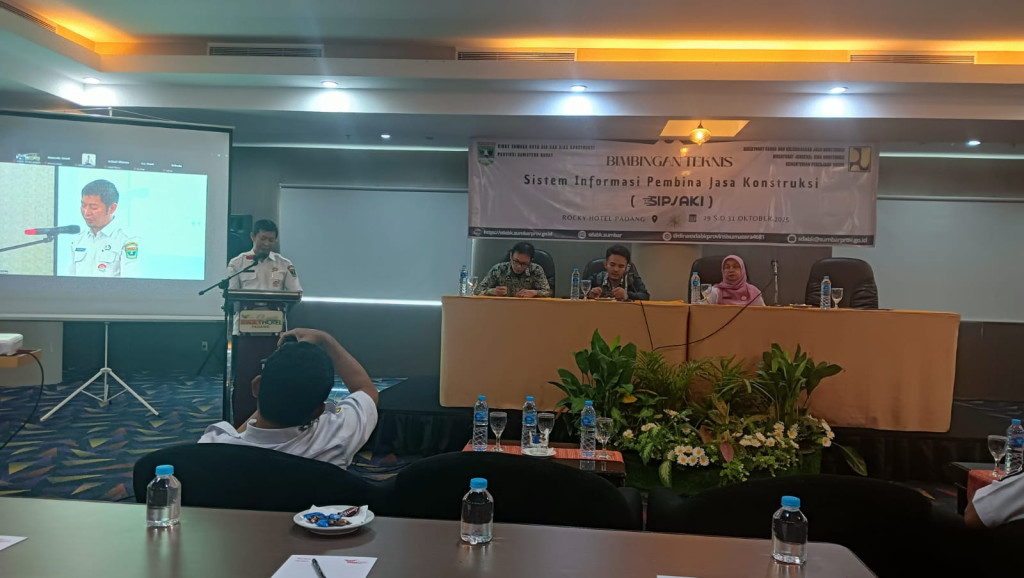 Dalam rangka penghimpunan data Jasa Konstruksi Tahun 2025 Dinas Sumber Daya Air dan Bina Konstruksi Provinsi Sumatera Barat mengundang Dinas PUPR di 19 Kabupaten/Kota se Sumatera Barat untuk mengikuti Pelatihan SIPJAKI di Hotel Rocky Plaza Padang pada tanggal 29 s/d 31 Oktober 2025. Nara Sumber kegiatan ini adalah Kementerian Pekerjaan Umum Republik Indonesia Jakarta.